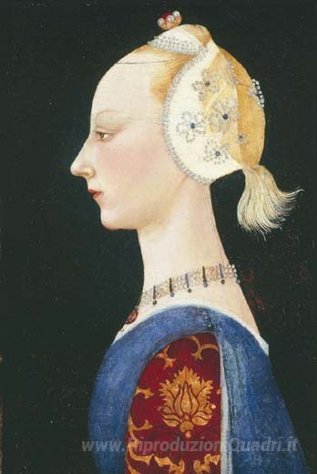 Ti offriamo una riproduzione artigianale su tela dell'opera famosa 'Una giovane signora della moda' di Paolo Uccello, dal Museo delle Riproduzioni.