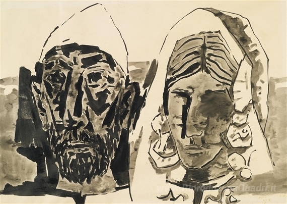 Ti offriamo una riproduzione artigianale su tela dell'opera famosa 'Untitled (Kashmir coppia)' di M.F. Husain, dal Museo delle Riproduzioni.