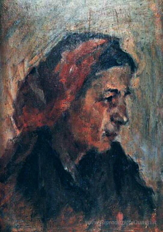 Ti offriamo una riproduzione artigianale su tela dell'opera famosa 'Vecchia donna con la sciarpa rossa' di George Bouzianis, dal Museo delle Riproduzioni.