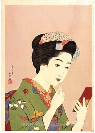 Ti offriamo una riproduzione artigianale su tela dell'opera famosa 'Woman Holding Rossetto' di Goyo Hashiguchi, dal Museo delle Riproduzioni.
