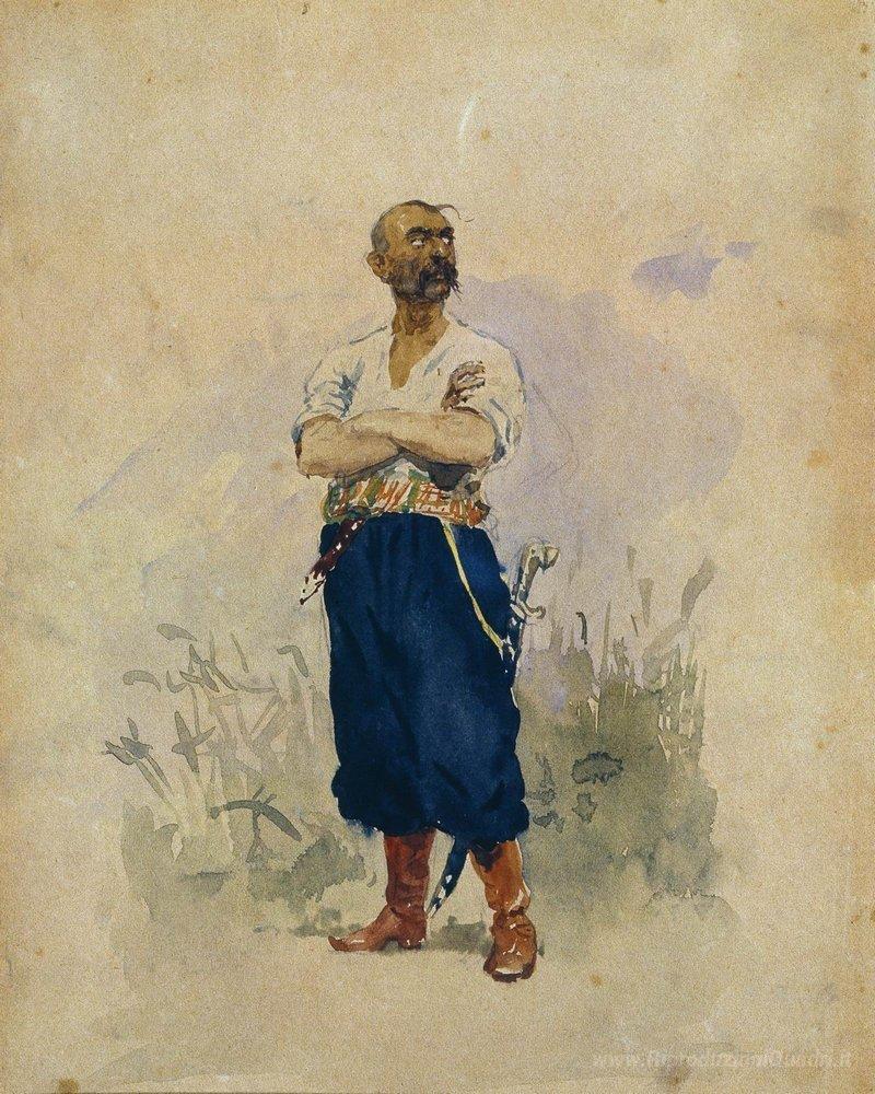 Ti offriamo una riproduzione artigianale su tela dell'opera famosa 'Zaporozhets' di Ilya Repin, dal Museo delle Riproduzioni.