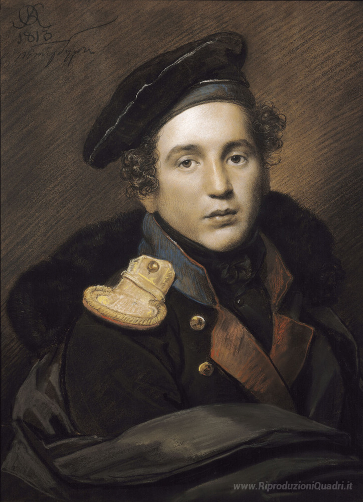 Ti offriamo una riproduzione artigianale su tela dell'opera famosa 'Ritratto di Pyotr Olenin' di Orest Kiprensky, dal Museo delle Riproduzioni.