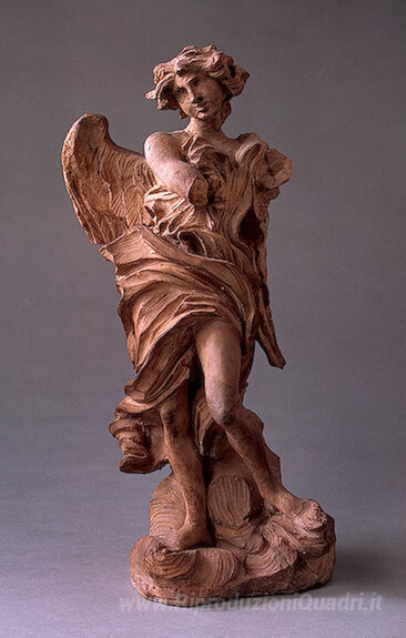 Ti offriamo una riproduzione artigianale su tela dell'opera famosa 'Angelo con il Iscrizione di I.N.R.I.' di Gian Lorenzo Bernini, dal Museo delle Riproduzioni.