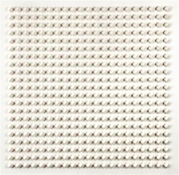 Ti offriamo una riproduzione artigianale su tela dell'opera famosa 'Atmosphère chromoplastique N ° 572' di Luis Tomasello, dal Museo delle Riproduzioni.