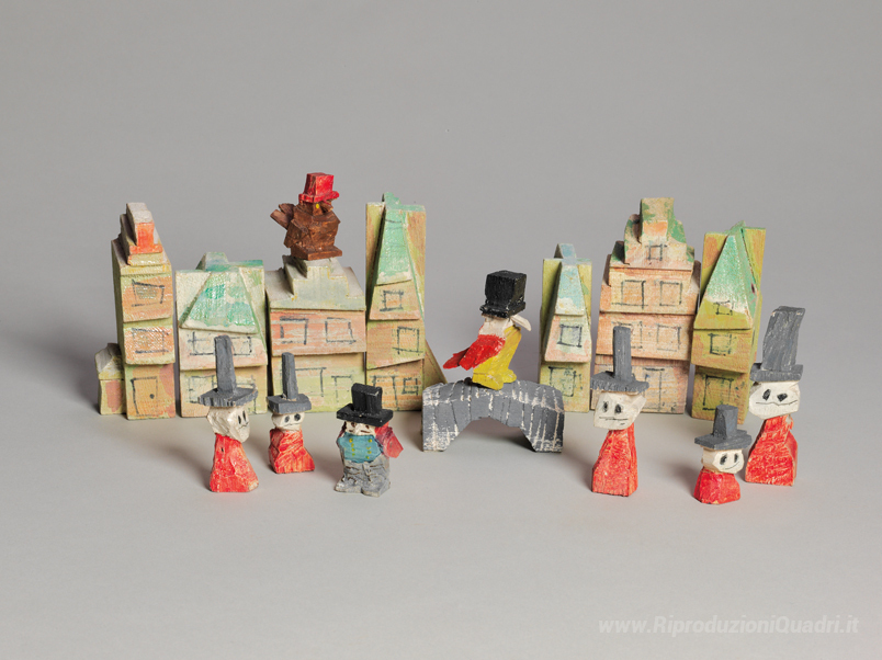 Ti offriamo una riproduzione artigianale su tela dell'opera famosa 'Case e cifre (Uccelli con cappelli)' di Lyonel Feininger, dal Museo delle Riproduzioni.