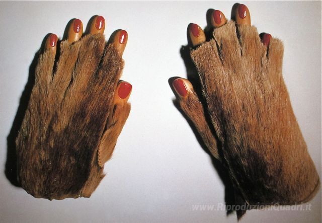 Ti offriamo una riproduzione artigianale su tela dell'opera famosa 'Guanti da pelliccia con le dita di legno' di Meret Oppenheim, dal Museo delle Riproduzioni.