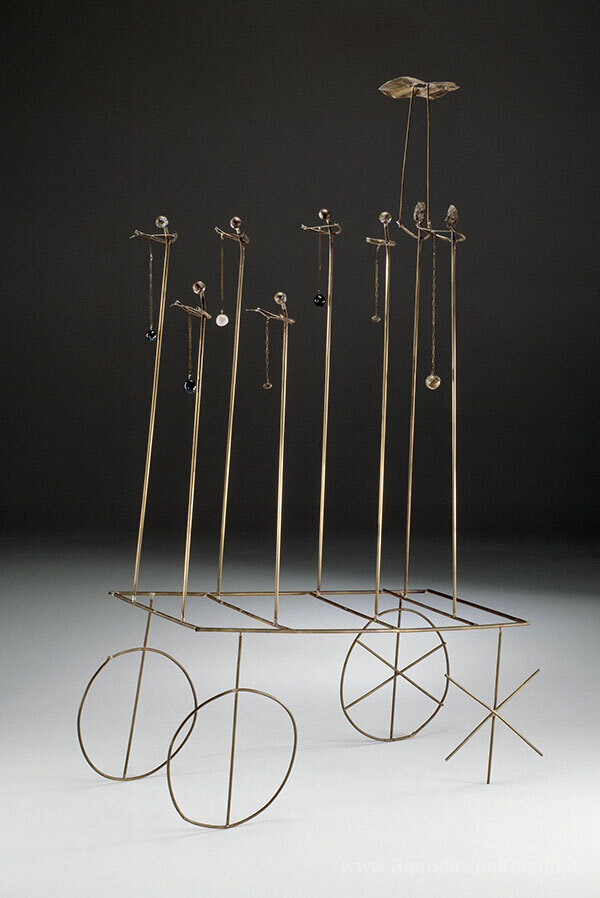 Ti offriamo una riproduzione artigianale su tela dell'opera famosa 'Il carro dei rabdomanti' di Fausto Melotti, dal Museo delle Riproduzioni.