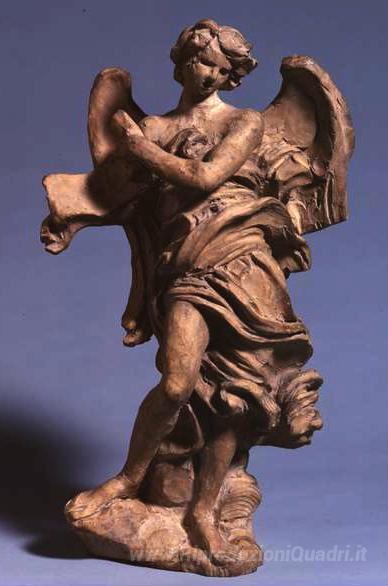 Ti offriamo una riproduzione artigianale su tela dell'opera famosa 'In piedi Angelo con Scroll' di Gian Lorenzo Bernini, dal Museo delle Riproduzioni.