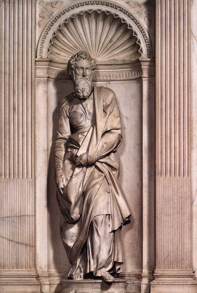 Ti offriamo una riproduzione artigianale su tela dell'opera famosa 'San Pietro' di Michelangelo, dal Museo delle Riproduzioni.
