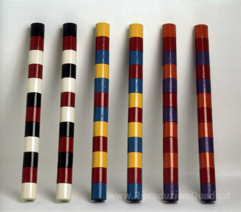 Ti offriamo una riproduzione artigianale su tela dell'opera famosa 'Sei tonde barre di legno' di Andre Cadere, dal Museo delle Riproduzioni.
