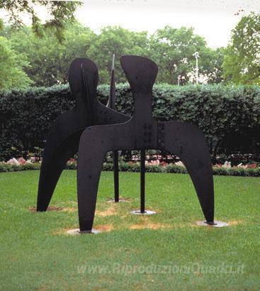 Ti offriamo una riproduzione artigianale su tela dell'opera famosa 'Tre Dissuasori' di Alexander Calder, dal Museo delle Riproduzioni.