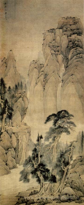 Ti offriamo una riproduzione artigianale su tela dell'opera famosa 'Pini e la cascata' di Lan Ying, dal Museo delle Riproduzioni.