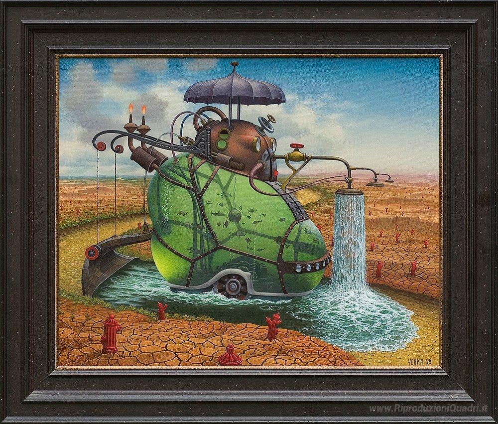 Ti offriamo una riproduzione artigianale su tela dell'opera famosa 'Acquario' di Jacek Yerka, dal Museo delle Riproduzioni.