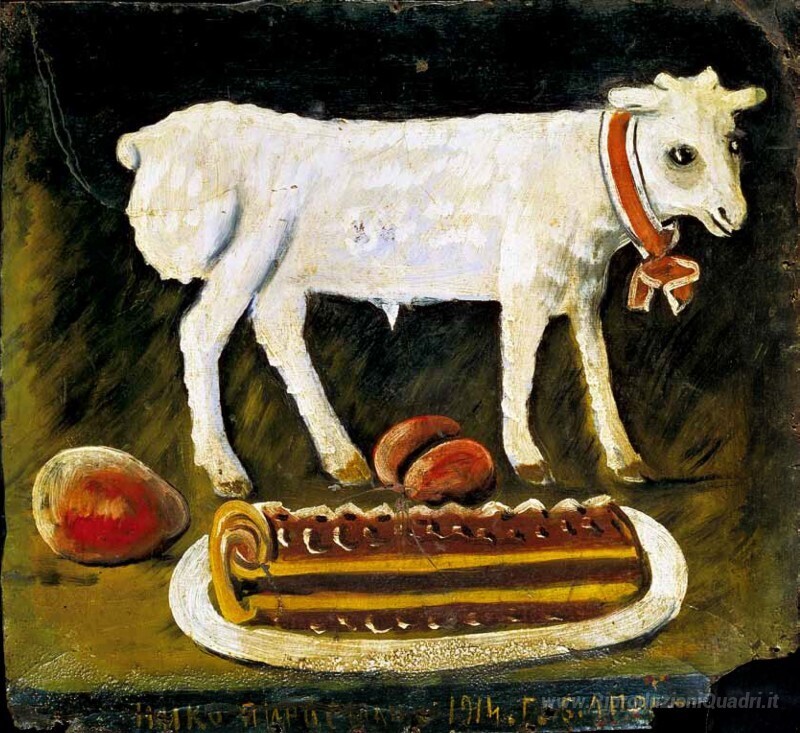 Ti offriamo una riproduzione artigianale su tela dell'opera famosa 'Agnello pasquale' di Niko Pirosmani, dal Museo delle Riproduzioni.