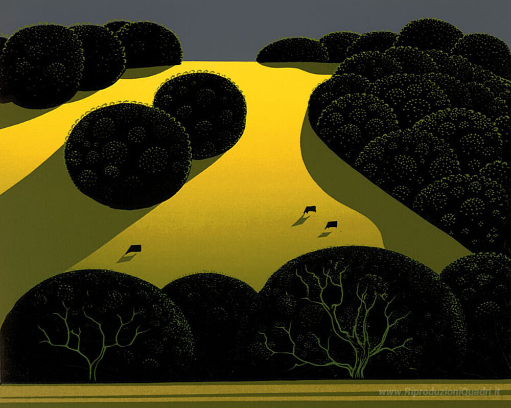Ti offriamo una riproduzione artigianale su tela dell'opera famosa 'Alamo Pintada' di Eyvind Earle, dal Museo delle Riproduzioni.