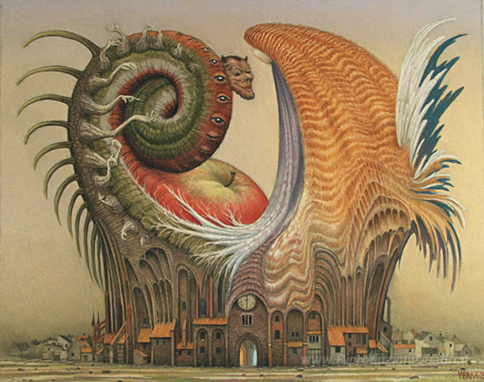 Ti offriamo una riproduzione artigianale su tela dell'opera famosa 'All'ombra del Duomo' di Jacek Yerka, dal Museo delle Riproduzioni.