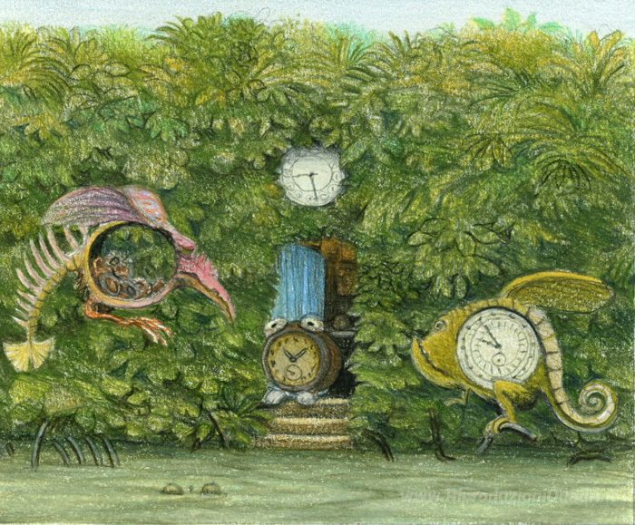 Ti offriamo una riproduzione artigianale su tela dell'opera famosa 'Amazon Clock Maker' di Jacek Yerka, dal Museo delle Riproduzioni.