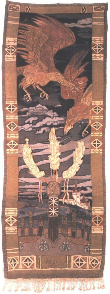 Ti offriamo una riproduzione artigianale su tela dell'opera famosa 'Aquile sopra Grave dell'Eroe' di Aladar Korosfoi-Kriesch, dal Museo delle Riproduzioni.