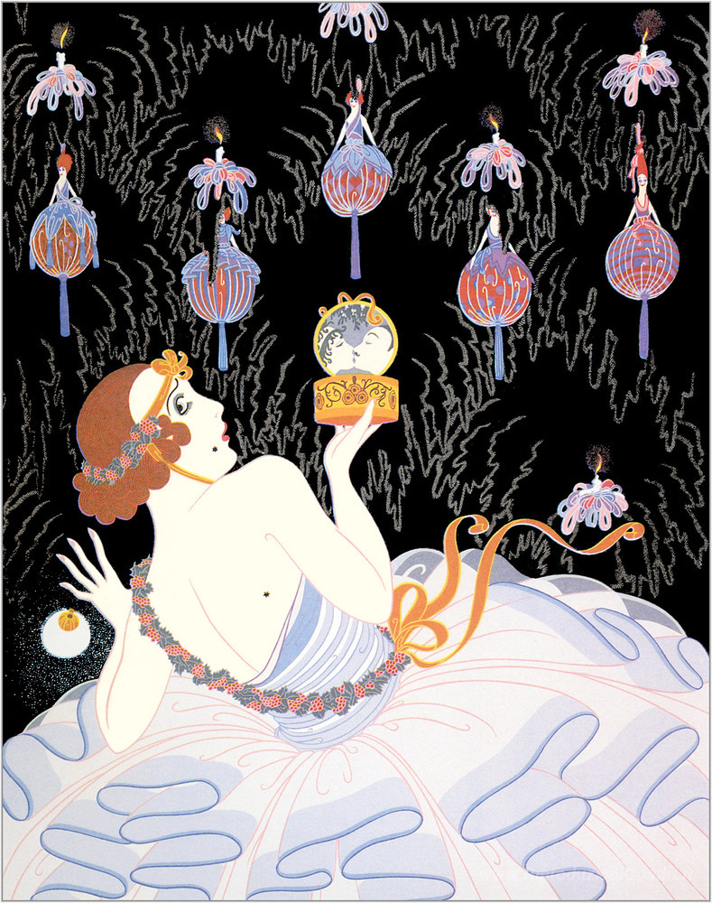 Ti offriamo una riproduzione artigianale su tela dell'opera famosa 'Baci rubati' di Erte, dal Museo delle Riproduzioni.