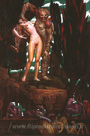 Ti offriamo una riproduzione artigianale su tela dell'opera famosa 'BALLANDO CON LA MORTE' di Ernst Fuchs, dal Museo delle Riproduzioni.