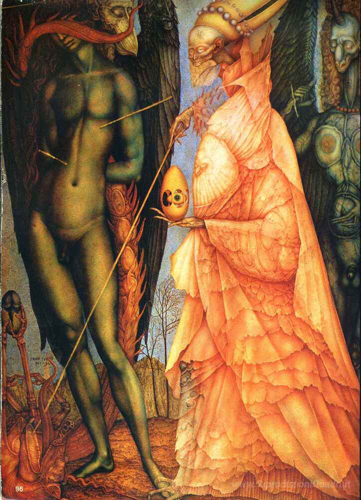 Ti offriamo una riproduzione artigianale su tela dell'opera famosa 'Battaglia degli dèi che sono state trasformate' di Ernst Fuchs, dal Museo delle Riproduzioni.