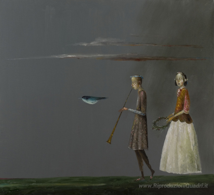 Ti offriamo una riproduzione artigianale su tela dell'opera famosa 'Blue Bird Singer' di Stefan Caltia, dal Museo delle Riproduzioni.