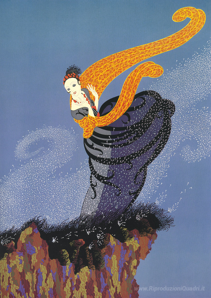 Ti offriamo una riproduzione artigianale su tela dell'opera famosa 'Brezza estiva' di Erte, dal Museo delle Riproduzioni.