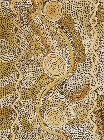 Ti offriamo una riproduzione artigianale su tela dell'opera famosa 'Bush Tucker After Rain' di Johnny Warangkula Tjupurrula, dal Museo delle Riproduzioni.