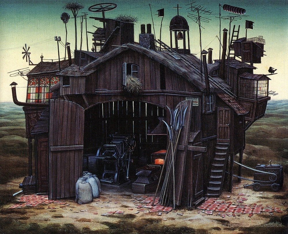 Ti offriamo una riproduzione artigianale su tela dell'opera famosa 'Capannone di ribellione' di Jacek Yerka, dal Museo delle Riproduzioni.