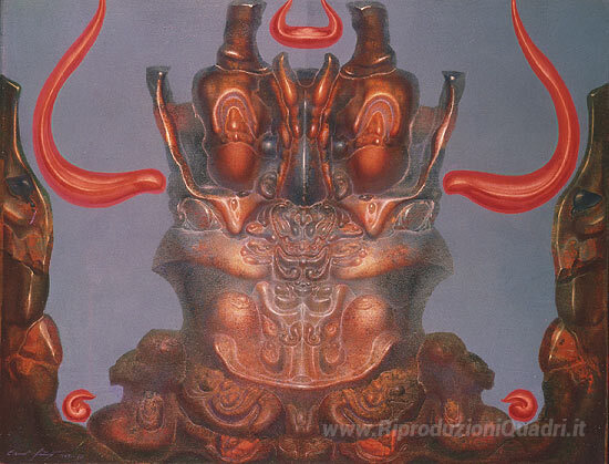 Ti offriamo una riproduzione artigianale su tela dell'opera famosa 'CHERUB IT VISO CON L'ARANCIO-COLORATO CORNA DI FIAMME' di Ernst Fuchs, dal Museo delle Riproduzioni.