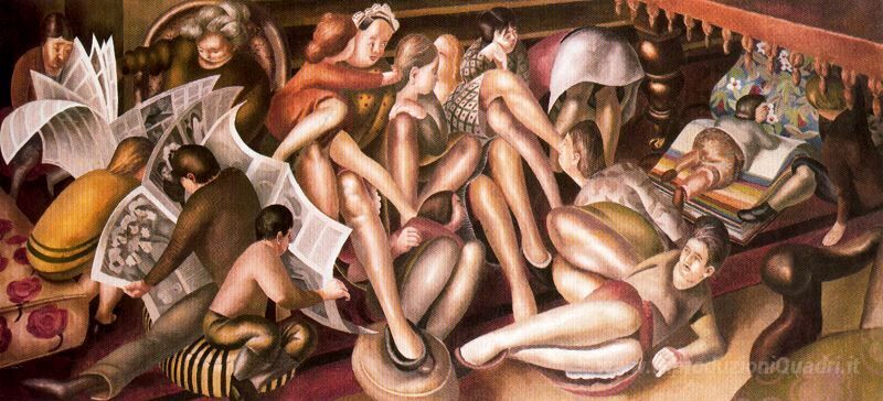 Ti offriamo una riproduzione artigianale su tela dell'opera famosa 'Damigelle d'onore a Cana' di Stanley Spencer, dal Museo delle Riproduzioni.