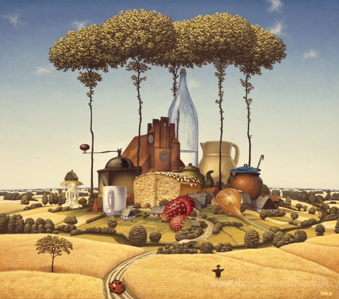 Ti offriamo una riproduzione artigianale su tela dell'opera famosa 'Estate' di Jacek Yerka, dal Museo delle Riproduzioni.