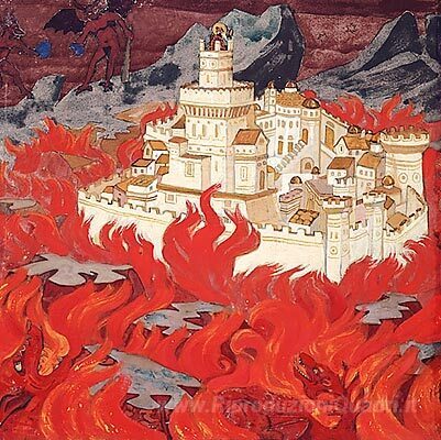 Ti offriamo una riproduzione artigianale su tela dell'opera famosa 'Fairest City - la rabbia per i nemici' di Nicholas Roerich, dal Museo delle Riproduzioni.