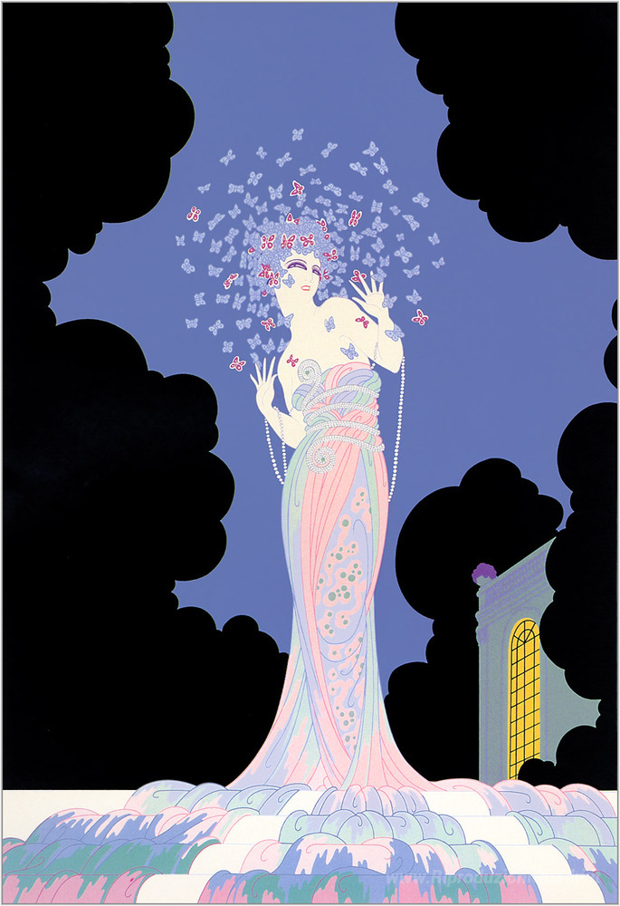 Ti offriamo una riproduzione artigianale su tela dell'opera famosa 'Fantasia' di Erte, dal Museo delle Riproduzioni.