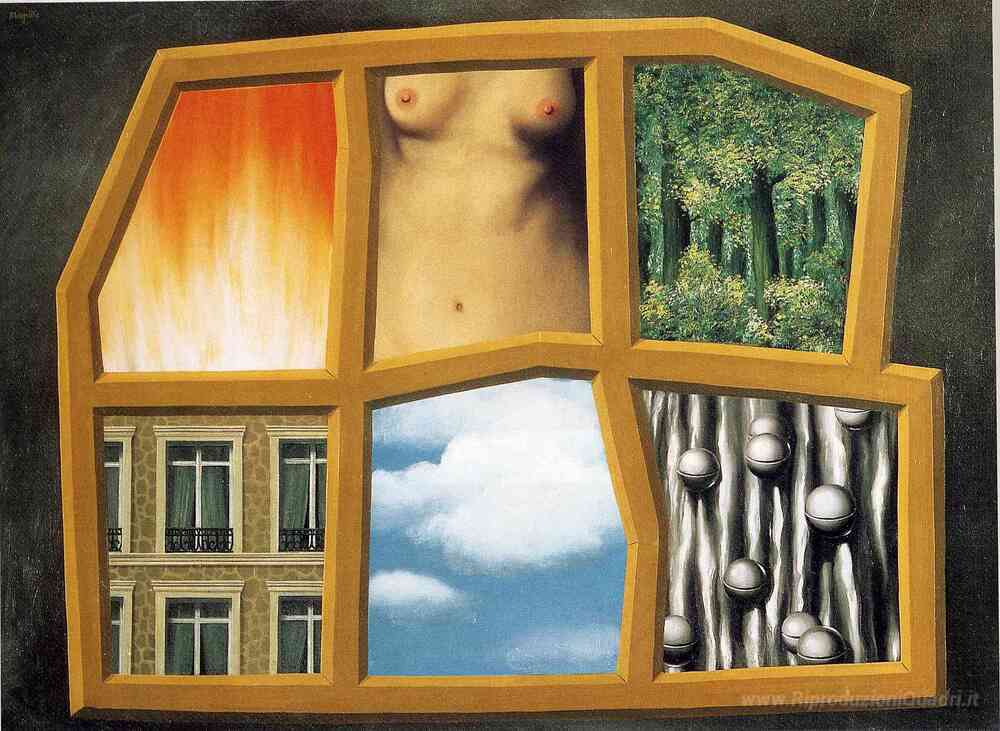 Ti offriamo una riproduzione artigianale su tela dell'opera famosa 'I sei elementi' di Rene Magritte, dal Museo delle Riproduzioni.