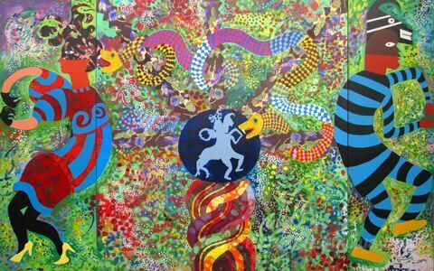 Ti offriamo una riproduzione artigianale su tela dell'opera famosa 'Il gemellaggio di Adamo ed Eva nel Giardino dell'Eden' di Miriam Schapiro, dal Museo delle Riproduzioni.
