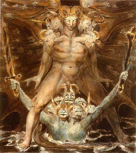 Ti offriamo una riproduzione artigianale su tela dell'opera famosa 'Il Grande Drago Rosso e la Bestia dal Mare' di William Blake, dal Museo delle Riproduzioni.