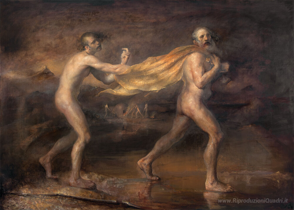 Ti offriamo una riproduzione artigianale su tela dell'opera famosa 'Il mantello d'oro' di Odd Nerdrum, dal Museo delle Riproduzioni.