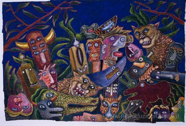 Ti offriamo una riproduzione artigianale su tela dell'opera famosa 'Impressioni d'Africa' di Enrico Baj, dal Museo delle Riproduzioni.