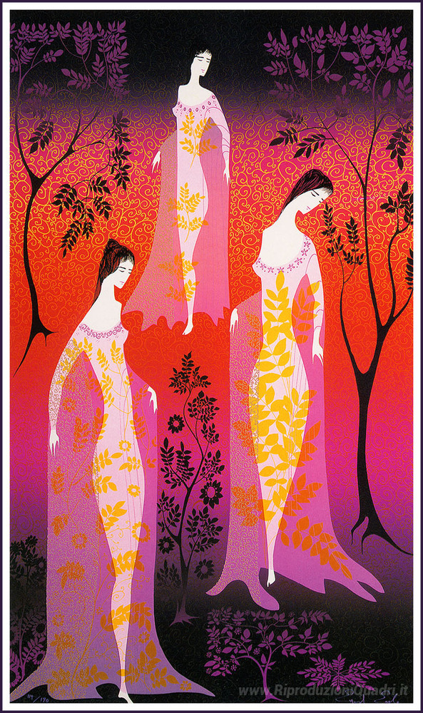 Ti offriamo una riproduzione artigianale su tela dell'opera famosa 'In un giardino gotico' di Eyvind Earle, dal Museo delle Riproduzioni.