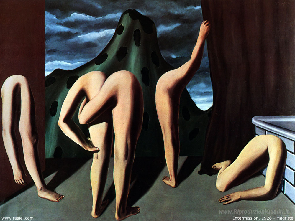 Ti offriamo una riproduzione artigianale su tela dell'opera famosa 'Intervallo' di Rene Magritte, dal Museo delle Riproduzioni.
