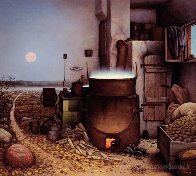 Ti offriamo una riproduzione artigianale su tela dell'opera famosa 'La produzione illegale di Luce' di Jacek Yerka, dal Museo delle Riproduzioni.