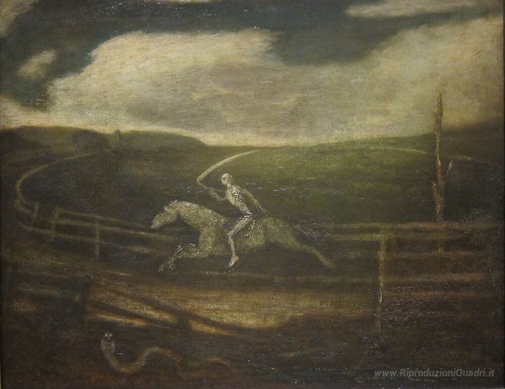Ti offriamo una riproduzione artigianale su tela dell'opera famosa 'La Race Track (Death on a Pale Horse)' di Albert Pinkham Ryder, dal Museo delle Riproduzioni.