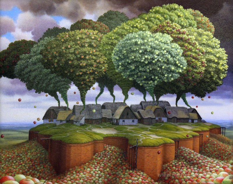 Ti offriamo una riproduzione artigianale su tela dell'opera famosa 'La Ricetta Cider' di Jacek Yerka, dal Museo delle Riproduzioni.