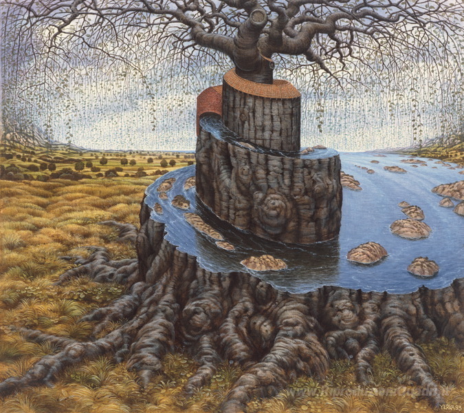 Ti offriamo una riproduzione artigianale su tela dell'opera famosa 'L'albero del mondo' di Jacek Yerka, dal Museo delle Riproduzioni.