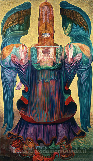 Ti offriamo una riproduzione artigianale su tela dell'opera famosa 'L'ANGELO DELLA STORIA' di Ernst Fuchs, dal Museo delle Riproduzioni.