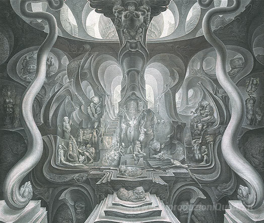 Ti offriamo una riproduzione artigianale su tela dell'opera famosa 'LAVORO E Il giudizio di Paride' di Ernst Fuchs, dal Museo delle Riproduzioni.