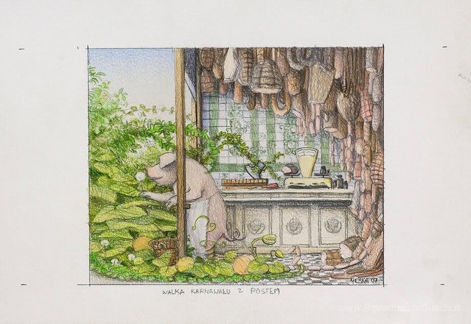Ti offriamo una riproduzione artigianale su tela dell'opera famosa 'Lotta tra Carnevale e Quaresima' di Jacek Yerka, dal Museo delle Riproduzioni.