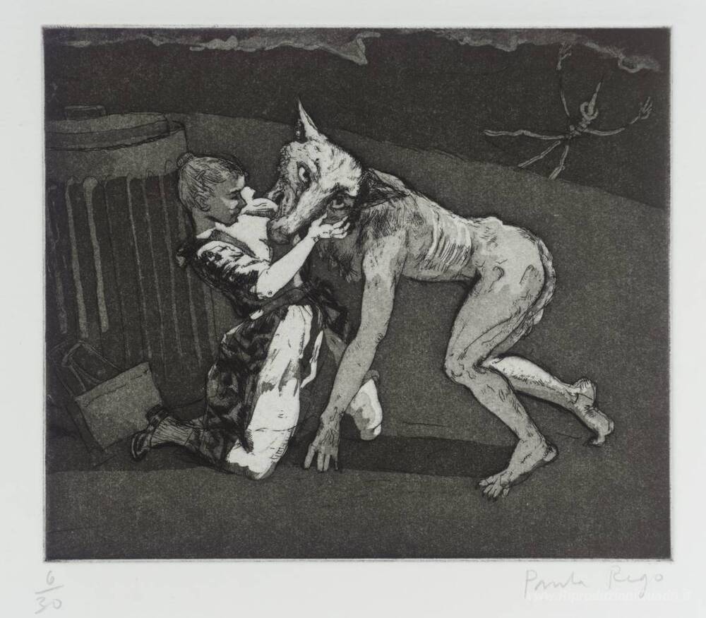 Ti offriamo una riproduzione artigianale su tela dell'opera famosa 'Lui' di Paula Rego, dal Museo delle Riproduzioni.