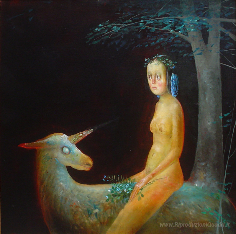 Ti offriamo una riproduzione artigianale su tela dell'opera famosa 'L'Unicorno nella foresta' di Stefan Caltia, dal Museo delle Riproduzioni.